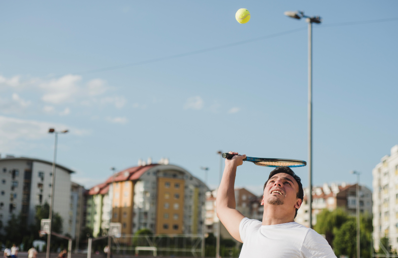 For tennis or pickleball players, that means practicing serves, groundstrokes, and volleys with controlled intensity.